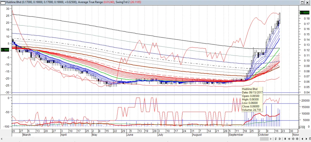 于是以6仙买入200张,结果此股在9月20日开始微动,以0.075 收市,后此股引擎开动,10月20日竟然升至0.19,蔡大卫还要观察,不急于脱手,但若以0.19沽出,也可以净赚25616,有211.84%  的回酬。从启动到有暴利,才不过是24个交易日。要在股市赚大钱,只有找黑马一条路。