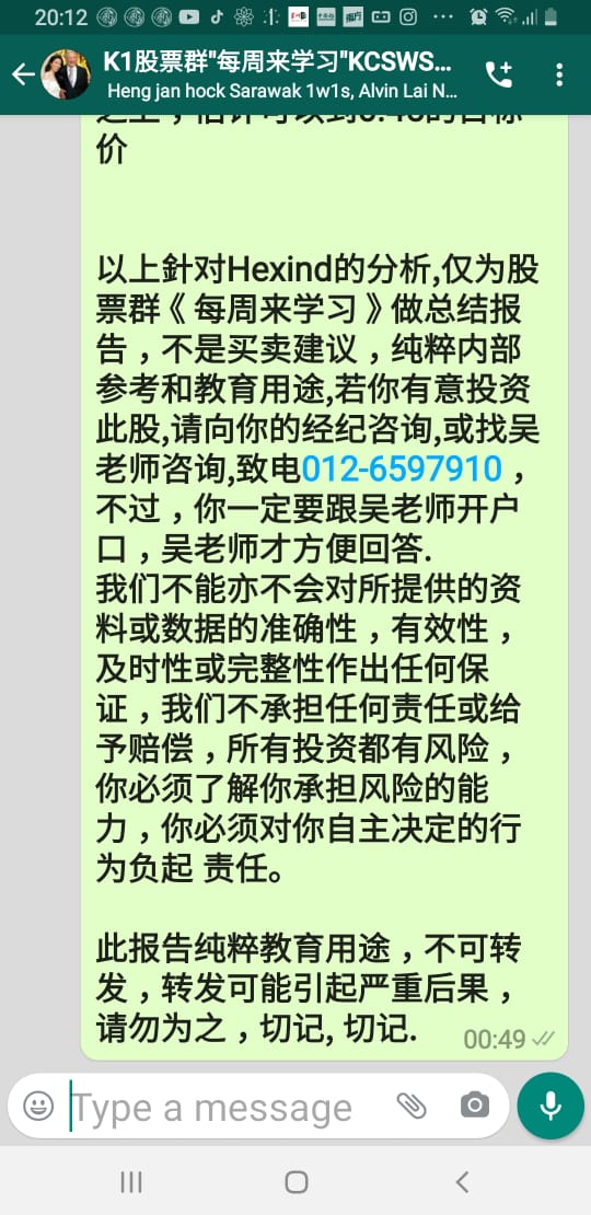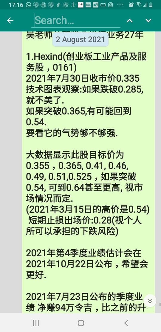 Hexind (0161)是吳老師在8月2日於淩晨12:49分,每週來學習的群组分享的一只股。